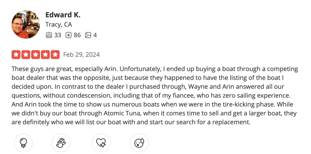 While the reviewer didn’t purchase their boat through Atomic Tuna Yachts this time, we’re honored to know that they consider us their top choice for future endeavors. When the time comes to sell their current boat and upgrade to a larger vessel, we’re thrilled to be their trusted partner in navigating the next chapter of their boating journey.